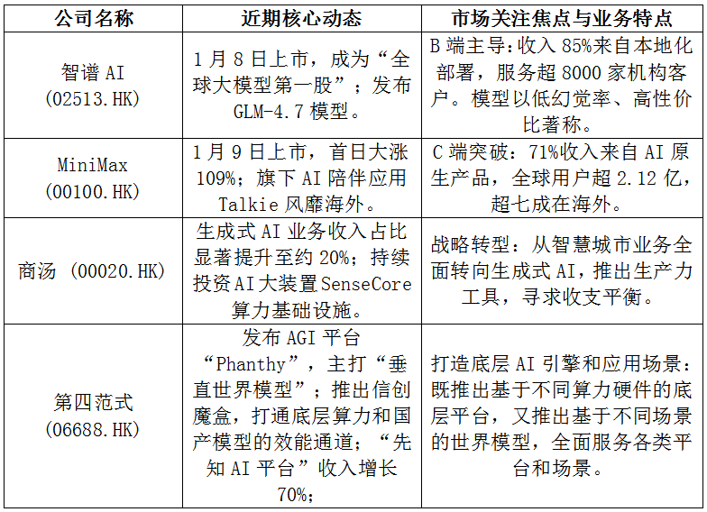 全体来看,市场情感显著回暖。各家企业基于本身定位配合鞭策行业关心度持续升温。智谱AI和MiniMax的IPO成功,